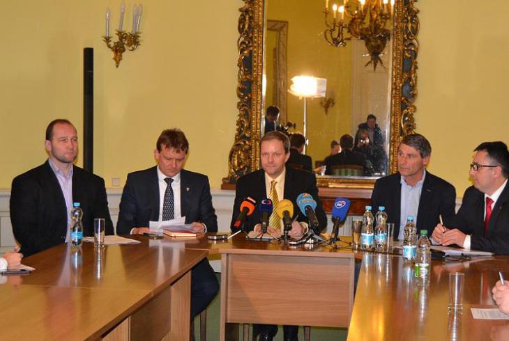 Ministr školství, mládeže a tělovýchovy Marcel Chládek obklopený olympijskými vítězi Jiřím Šlégrem, Martinem Doktorem a Janem Železným a svým náměstkem Petrem Hulinským oznámil, že jeho úřad chce pro sport o 3 miliardy korun vyšší příděl.