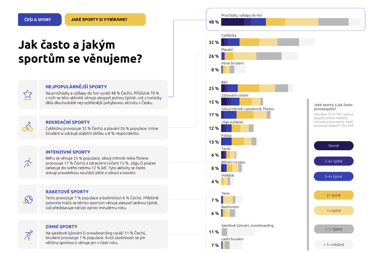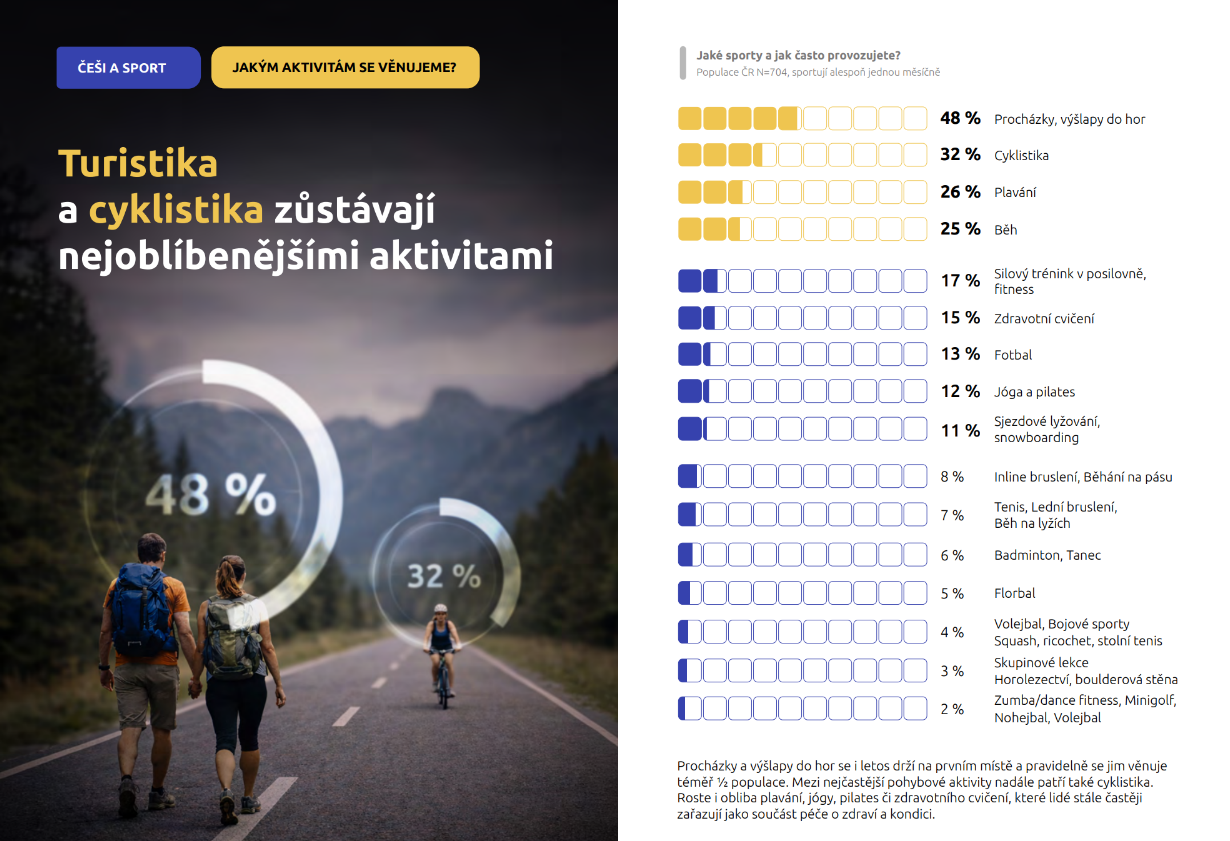 Proměňují se také sportovní preference ČechůProměňují se také sportovní preference Čechů. Covidový boom venkovních aktivit postupně odeznívá. Procházky a výšlapy sice zůstávají nejrozšířenější aktivitou, po vrcholu 58 % v roce 2020 se však jejich podíl drží na úrovni 47 až 48 %. Cyklistika oproti roku 2019 oslabila z 40 % přibližně na 32 %.