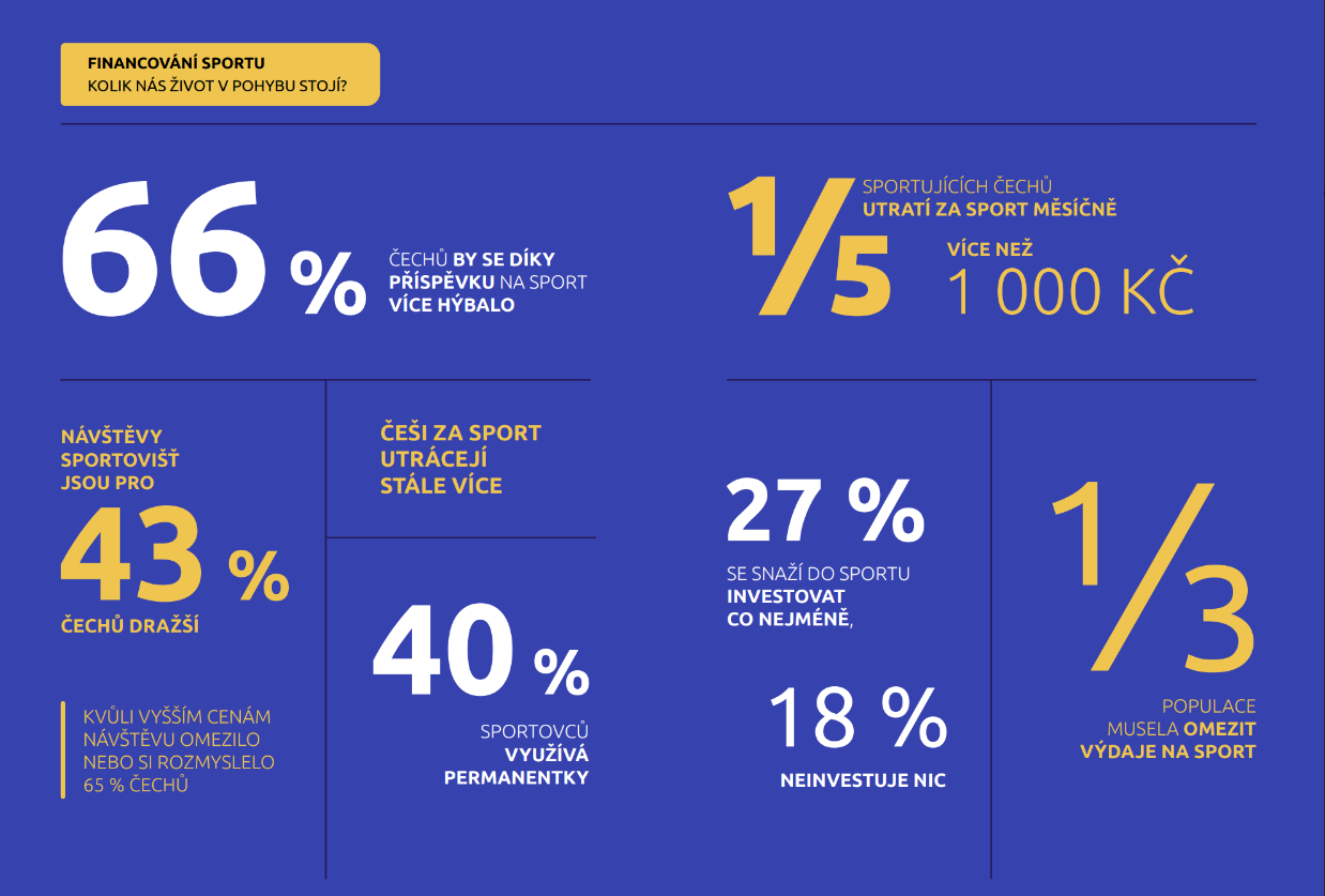 Aktivní životní styl je pro Čechy stále dražší. Zatímco před pěti lety označilo finance za hlavní překážku zdravého životního stylu 6 % lidí, letos je to už 13 %. Podíl Čechů, kteří v posledním roce zaznamenali zdražení sportovních zařízení nebo sportovních aktivit, vzrostl na 43 %. Více než třetina lidí navíc uvedla, že kvůli vyšším cenám navštěvuje sportoviště méně často. S těmito a s dalšími daty a údaji ve čtvrtek 2. dubna 2026 v Praze seznamili zástupce médií lidé reprezentující jednu sportovní organizaci, fakultu vysoké školy a firmu, která ta čísla může nazvýšit.