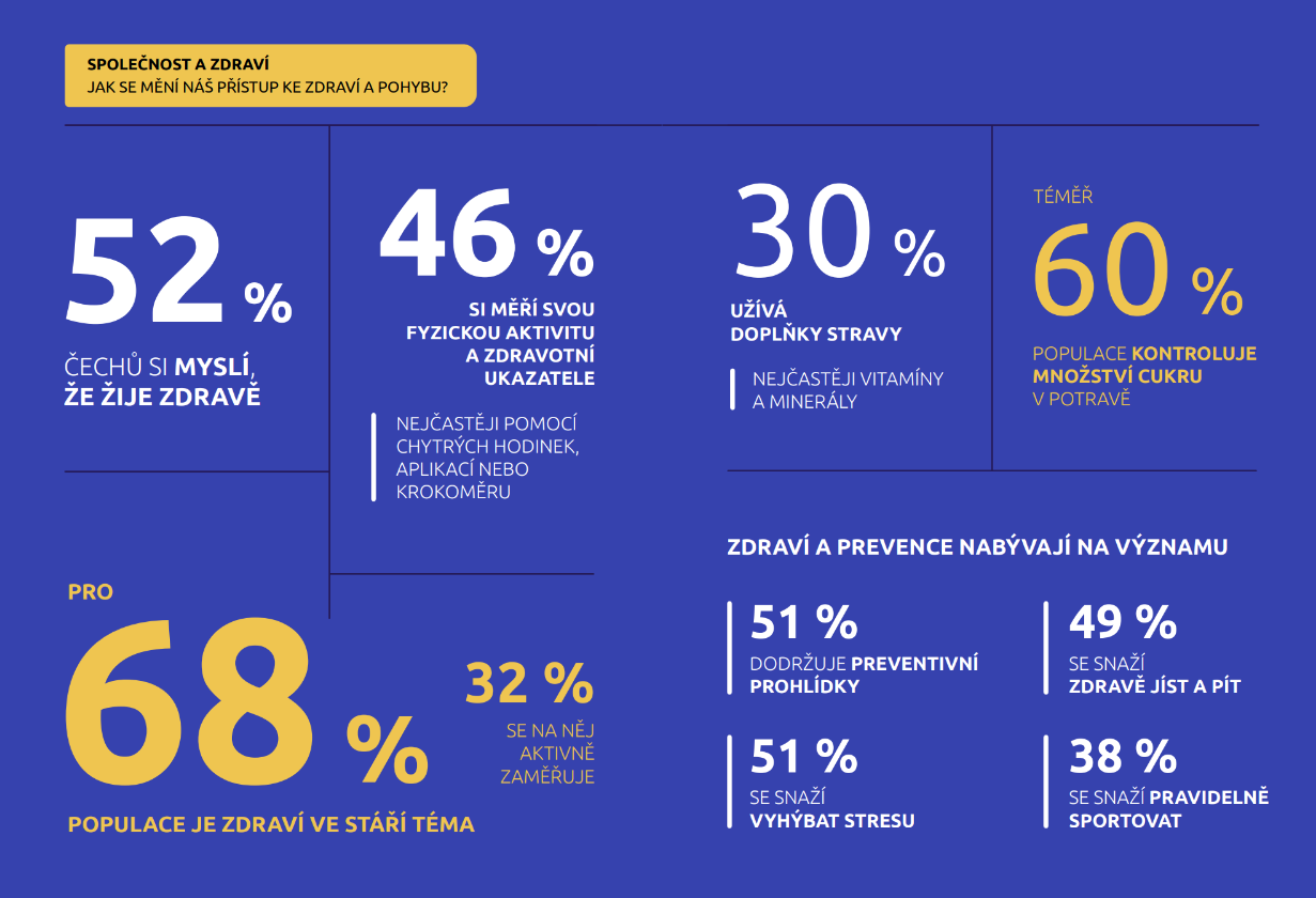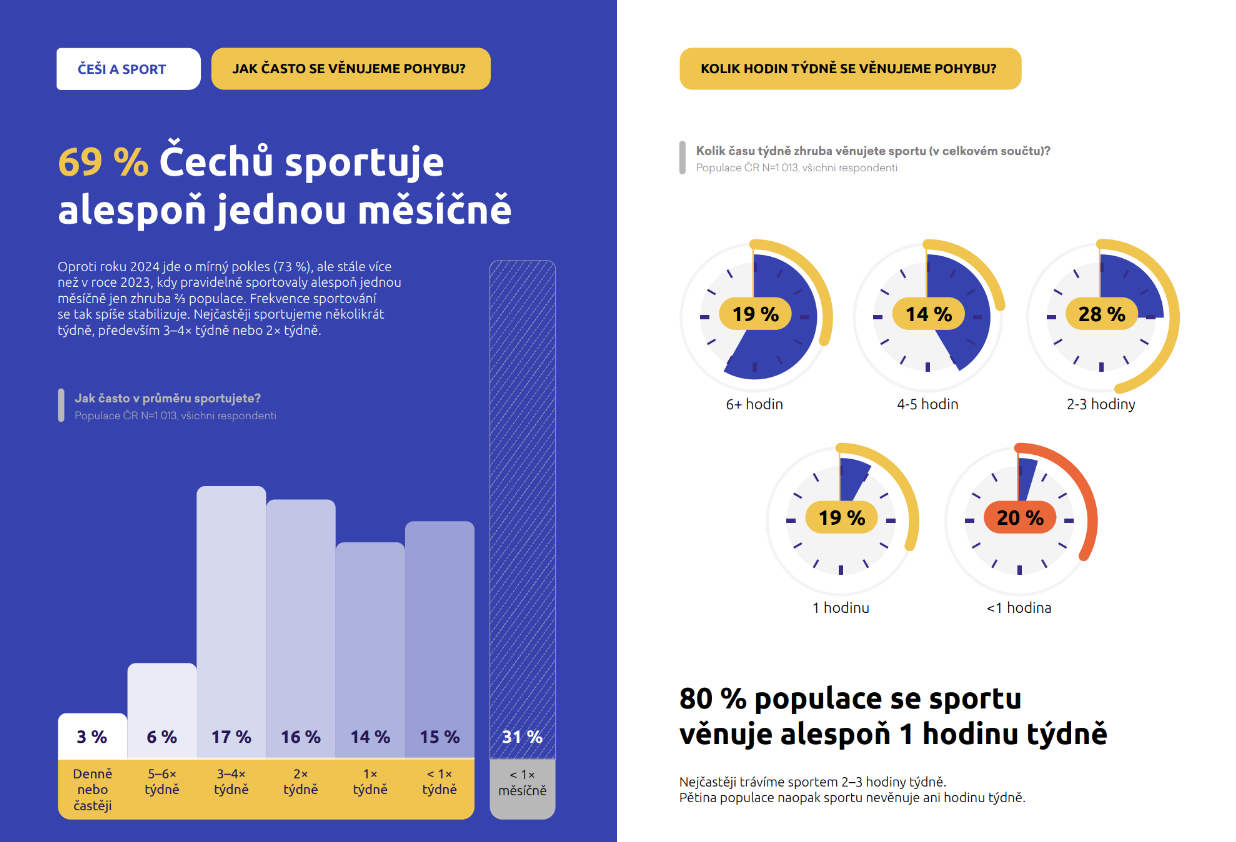 Míra pravidelného pohybu v české populaci se dlouhodobě výrazně nemění. Za sportující se označuje zhruba polovina Čechů. Výjimkou byl pouze rok 2022, kdy svůj pravidelný pohyb deklarovalo 66 % lidí, v dalších letech se ale ukázalo, že šlo spíše o dočasný výkyv než trvalou změnu. Více než čtvrtina Čechů se navíc hýbe méně než jednou měsíčně. Ti, kteří sportují, se ale pohybu věnují poměrně pravidelně, nejčastěji dvakrát až čtyřikrát týdně.