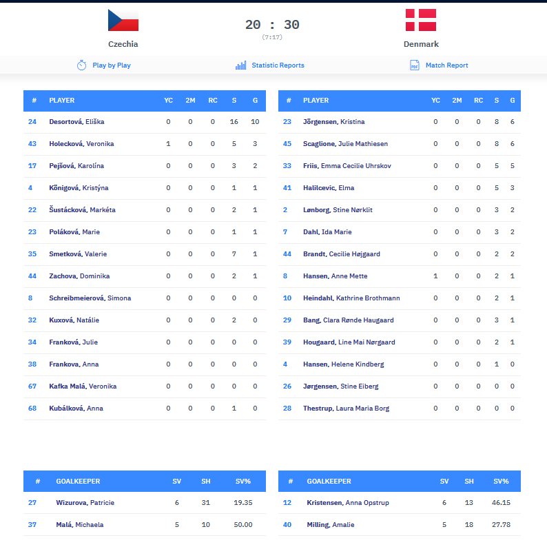 Češkám se zápas s aktuálními vicemistryněmi Evropy a s bronzovými olympijskými medailistkami nepovedl už v první půli, kterou prohrály 7:17. Domácí hráčky se zasekly po vstřelené třetí brance, kdy pak odhadem asi 17 minut neskorovaly a jenom dostávaly jednu branku za druhou až do skore 3:14. Za první poločas pak nakonec zapsaly jen sedm branek. Ve druhém poločase, ve kterém dosáhly házenkářky obou týmů stejného počtu 13 branek, byla hra vyrovnaná. Češky často hrály bez brankářky, což jim pomáhalo sice v útoku, ale nutno přiznat, že při této herní strategii domácí hráčky zase dostaly tři branky vstřelené Dánkami do opuštěné branky.