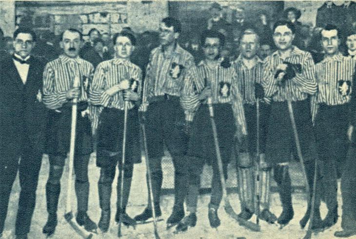 Češi: Wälzer, Pondělíček v brance, v obraně Pallauš, Fanda Rublič, dr. Fleischman, v útoku Josef Loos, Jirkovský, Káďa Pešek a Páral.