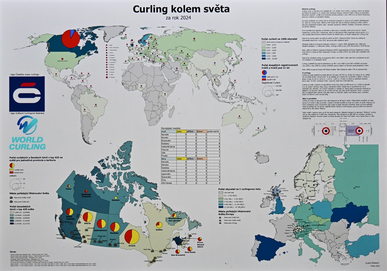 "Na předmětu Tematická kartografie na Přírodovědecké Fakultě Uiverzity Karlovy jsme dostali seminární projekt, ve kterém jsme měli vytvořit mapový soubor o velikosti A1. Bylo nám doporučeno vybrat si téma, které nás baví, a tak jsem zvolil curling. Se sběrem dat a jejich následným zpracováním mi tvor, ba mapy zabrala přibližně 80—90 hodin během tří měsíců. Data, která jsem použil, jsou uvedena v mapě, ale kromě jiného šlo i o aktuální žebříček týmů ze stránek WCF. K počtu hráčů jsem se dostal díky Jirkovi Snítiléovi, který mi dal kontakt na člověka z WCF s přístupem k obecným tabulkám. Obecně mi nejvíce času zabrala příprava a zpracování vstupních dat – tabulek a shapefile souborů pro jednotlivé mapy. Samotná tvorba mapy už pak byla jednodušší," řekl pro SportobniListy.cz Kryštof Žďárský.