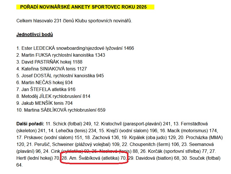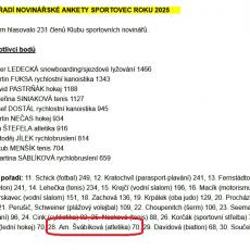 Umístění Amálie Švábíkové v anketě Sportovrc roku 2025