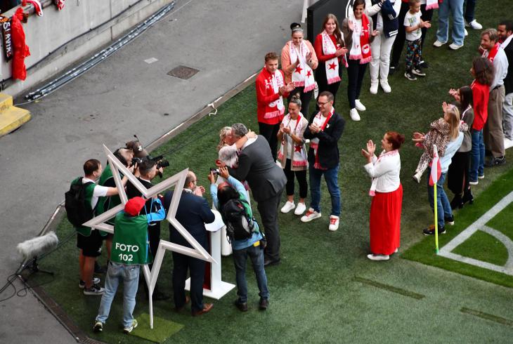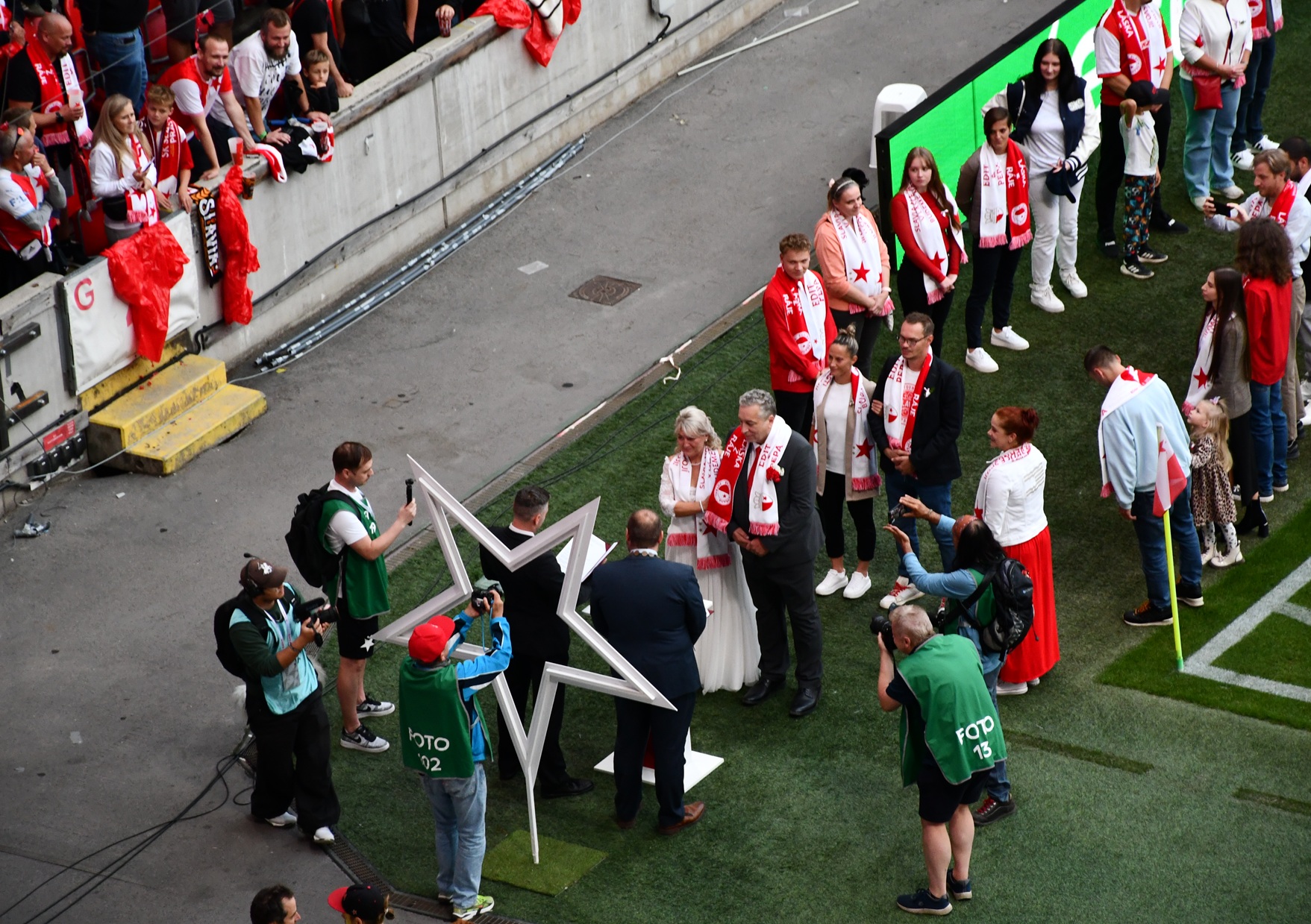 V rohu hřiště na levo z pohledu z hlavní tribuny o poločasu utkání Slavia Praha - Karviná se v sobotu 13. září 2025 odehrála svatba, kterou sice rušil komentář k dovednostní soutěži pro vybrané návštěvníky a předtím ještě reklamy, ale i tak svatební obřad neušel pozornosti většině z 19 tisíc přítomných diváků.