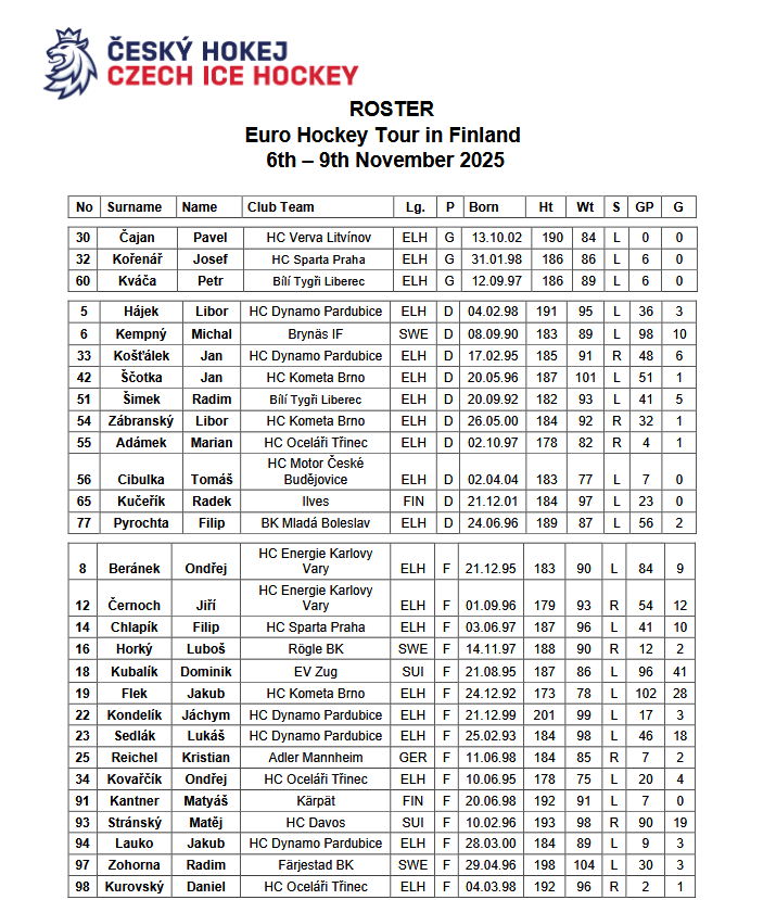 dobré formě z úvodu sezony. Turnaj nabídne tři zápasy nejdříve proti Švédsku, poté proti Finsku a nakoec proti Švýcarsku, které prověří připravenost českého týmu na vrchol nadcházející sezony – zimní olympijské hry v Miláně a Cortině d’Ampezzo 2026. Nominaci reprezentantů se novináři dozvěděli na setkání s nimi ve středu 29. října 2025 v Praze a tak i